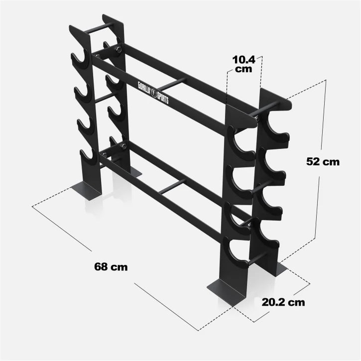 Hantelställ 300kg – Stilrent och stabilt hantelställ i pulverlackerat stål med plats för upp till åtta hantlar. Ger enkel förvaring och överblick över dina vikter.