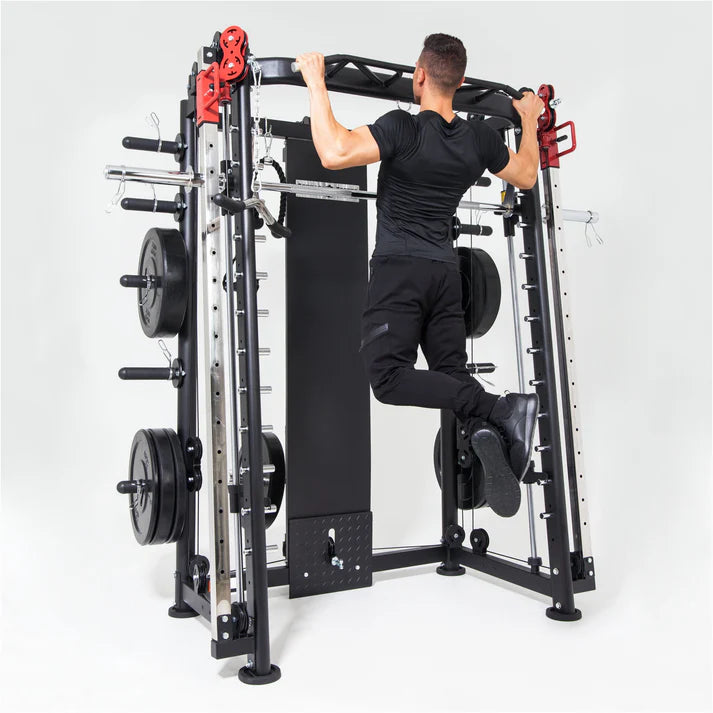 Smithmaskinen är välkonstruerad och passar alla träningsnivåer, nybörjare som proffs. Du kan träna hårt och säkert då smithmaskinen är utrustad med säkerhetshakar på skivstången samt säkerhetsstopp så du kan pressa dig själv närmare bristningsgränsen.
